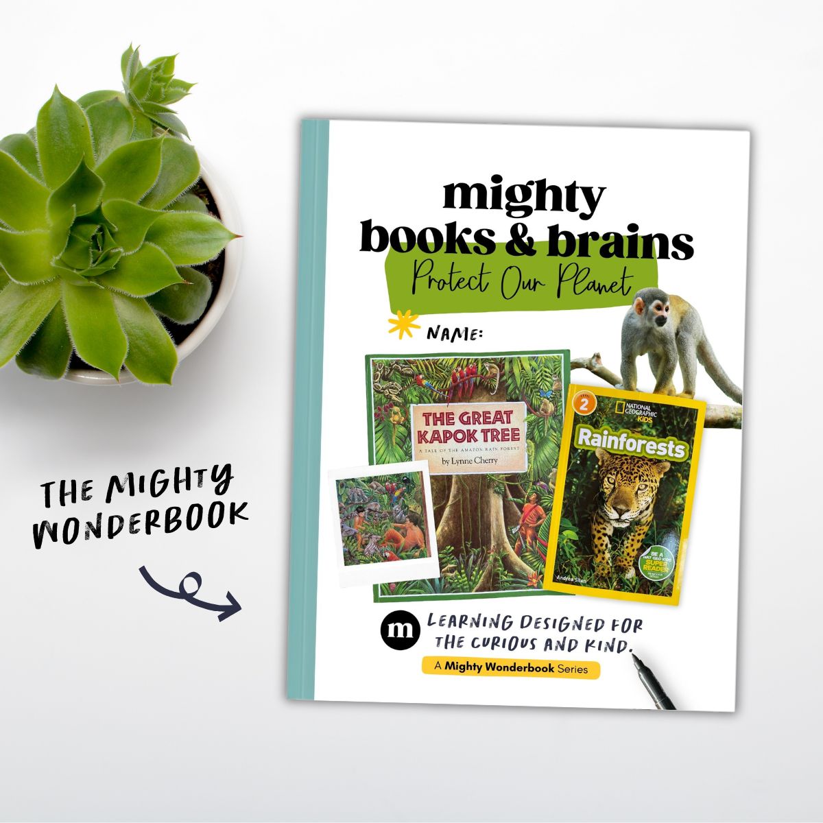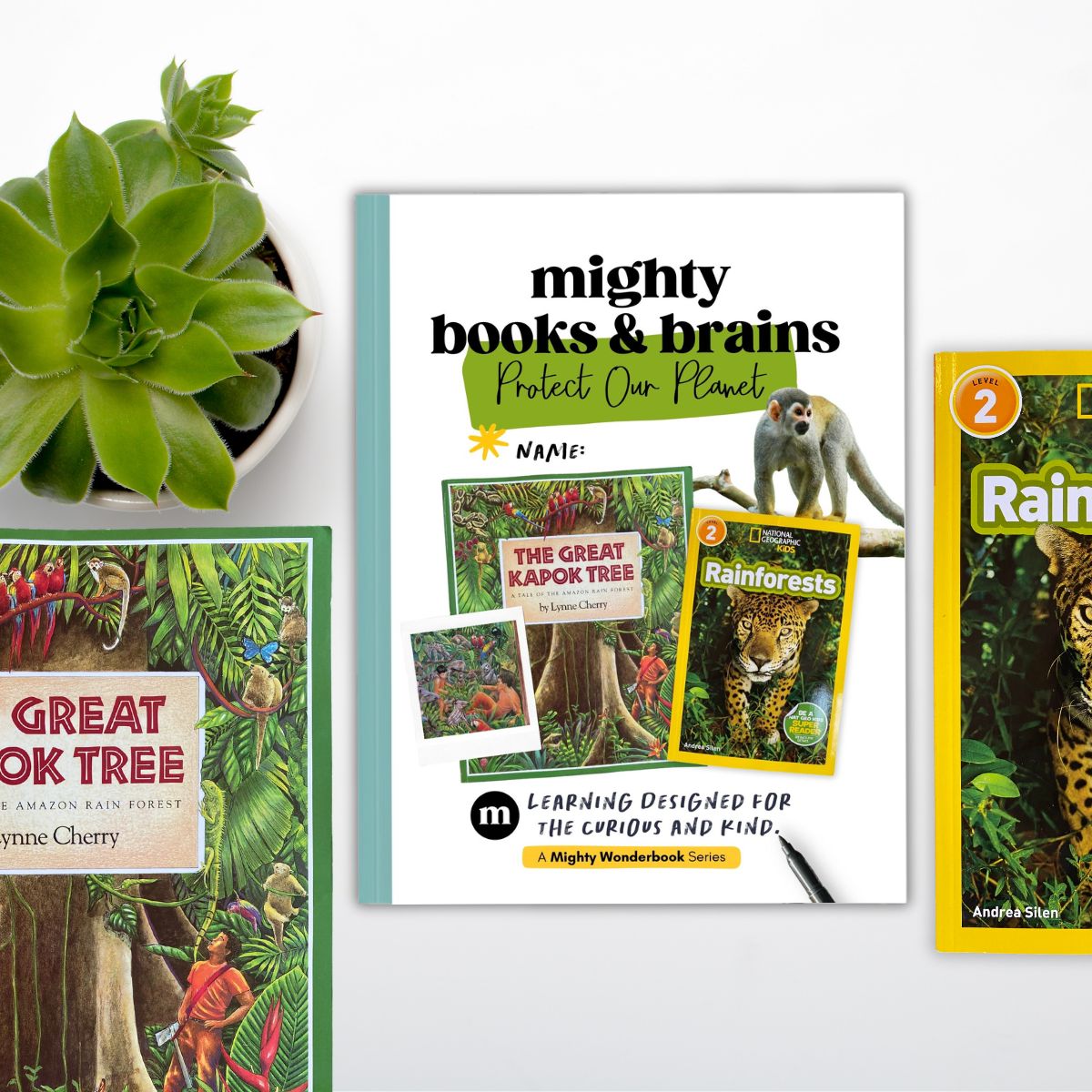 Swing into the Amazon with this Mighty Books & Brains box featuring The Great Kapok Tree by Lynne Cherry and Rainforests by Andrea Silen. The Mighty Wonderbook is bursting with projects and activities that help kids discover why rainforests are called the “lungs of the Earth. Young explorers will solve rainforest math challenges, research incredible rainforest animals, write a rainforest poem and so much more!
